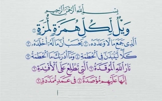 «بِسْمِ اَللّٰهِ اَلرَّحْمٰنِ اَلرَّحِیمِ وَیْلٌ لِکُلِّ هُمَزَهٍ لُمَزَهٍ * اَلَّذِی جَمَعَ مٰالاً وَ عَدَّدَهُ * یَحْسَبُ أَنَّ مٰالَهُ أَخْلَدَهُ * کَلاّٰ لَیُنْبَذَنَّ فِی اَلْحُطَمَهِ * وَ مٰا أَدْرٰاکَ مَا اَلْحُطَمَهُ * نٰارُ اَللّٰهِ اَلْمُوقَدَهُ * اَلَّتِی تَطَّلِعُ عَلَى اَلْأَفْئِدَهِ * إِنَّهٰا عَلَیْهِمْ مُؤْصَدَهٌ * فِی عَمَدٍ مُمَدَّدَهٍ؛ (1)