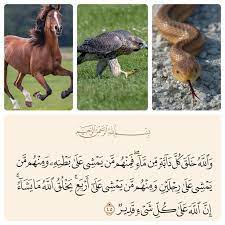«﴿وَ اَللّٰهُ خَلَقَ کُلَّ دَابَّهٍ مِنْ مٰاءٍ فَمِنْهُمْ مَنْ یَمْشِی عَلىٰ بَطْنِهِ وَ مِنْهُمْ مَنْ یَمْشِی عَلىٰ رِجْلَیْنِ وَ مِنْهُمْ مَنْ یَمْشِی عَلىٰ أَرْبَعٍ یَخْلُقُ اَللّٰهُ مٰا یَشٰاءُ إِنَّ اَللّٰهَ عَلىٰ کُلِّ شَیْءٍ قَدِیرٌ؛﴾ (1) و خدا هر جنبدهای را از آبی آفرید، پس گروهی از آنها بر شکمشان راه میروند و برخی از آنها به روی دو پا حرکت میکنند و بعضی از آنها بهروی چهارپا راه میروند. خدا آنچه را بخواهد میآفریند؛ مسلماً خدا بر هر کاری تواناست.»
