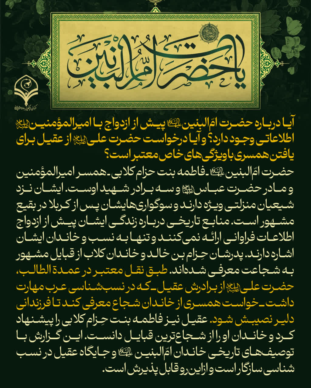 آیا درباره حضرت امّالبنین سلاماللهعلیها پیش از ازدواج با امیرالمؤمنین علیهالسلام اطلاعاتی وجود دارد؟