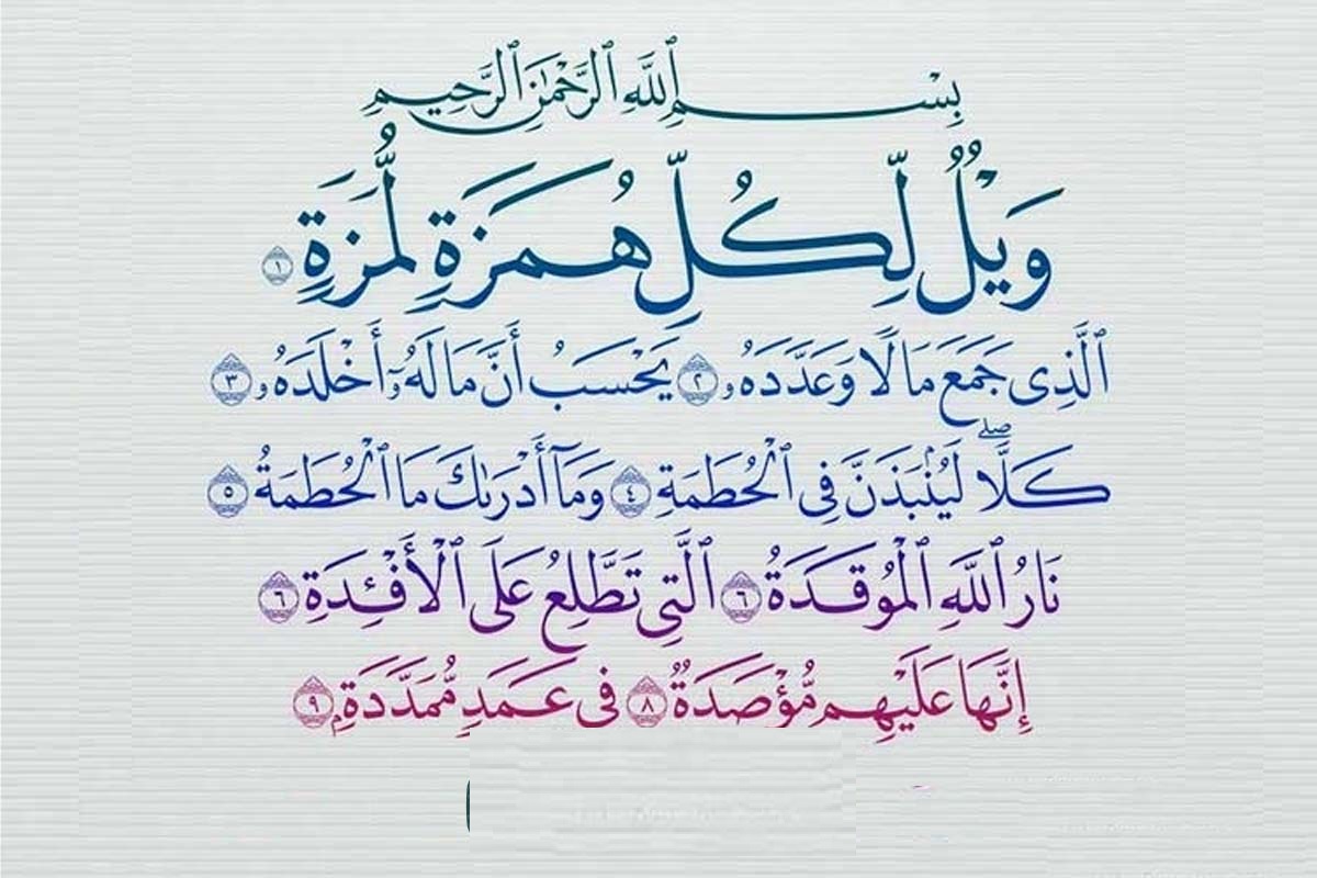 «بِسْمِ اَللّٰهِ اَلرَّحْمٰنِ اَلرَّحِیمِ وَیْلٌ لِکُلِّ هُمَزَهٍ لُمَزَهٍ * اَلَّذِی جَمَعَ مٰالاً وَ عَدَّدَهُ * یَحْسَبُ أَنَّ مٰالَهُ أَخْلَدَهُ * کَلاّٰ لَیُنْبَذَنَّ فِی اَلْحُطَمَهِ * وَ مٰا أَدْرٰاکَ مَا اَلْحُطَمَهُ * نٰارُ اَللّٰهِ اَلْمُوقَدَهُ * اَلَّتِی تَطَّلِعُ عَلَى اَلْأَفْئِدَهِ * إِنَّهٰا عَلَیْهِمْ مُؤْصَدَهٌ * فِی عَمَدٍ مُمَدَّدَهٍ؛ (1)